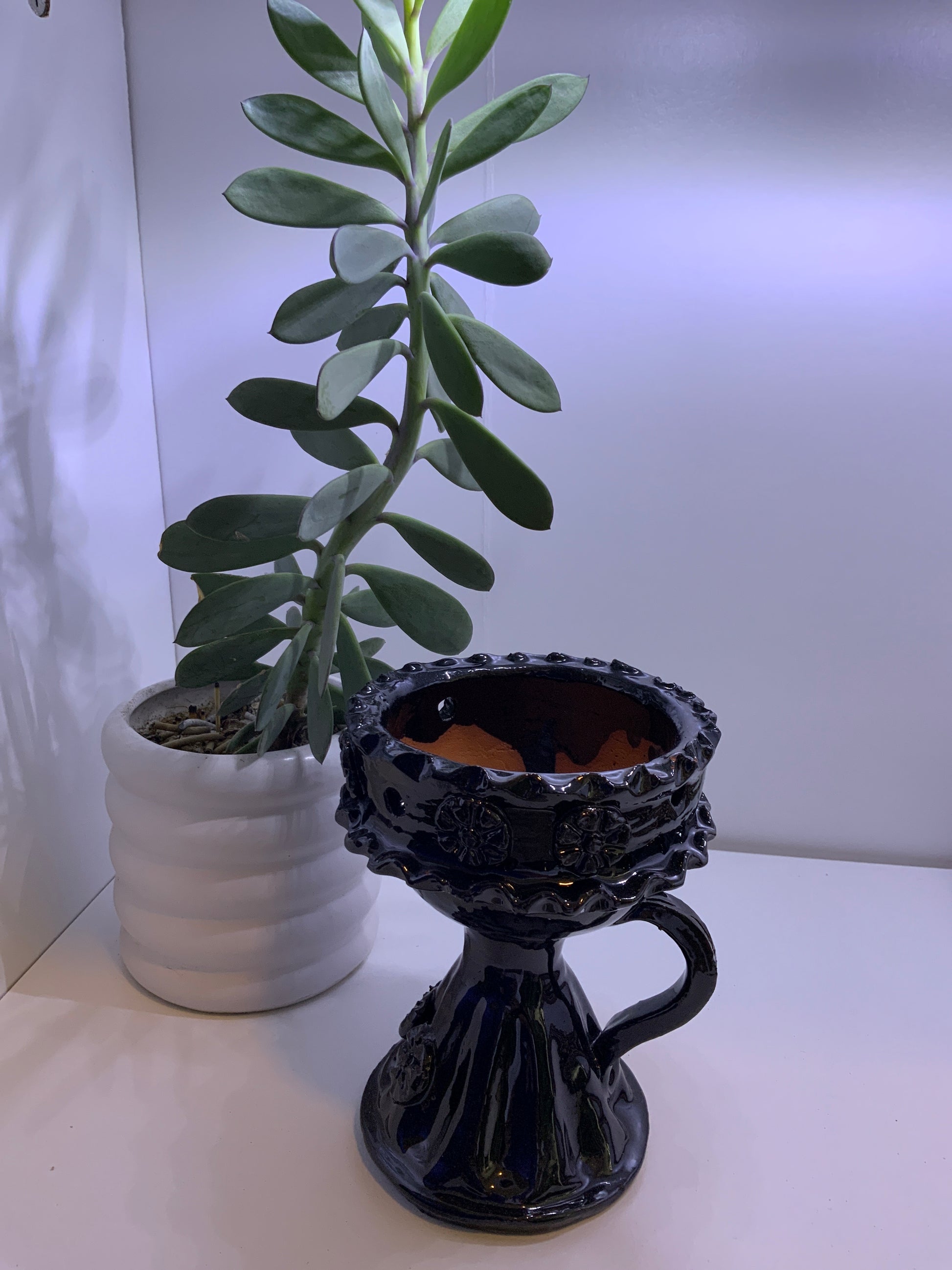 Copa de barro 4 pulgadas circunferencia y 6 pulgadas de alto decorado con flores, mango, espirales y volantes.