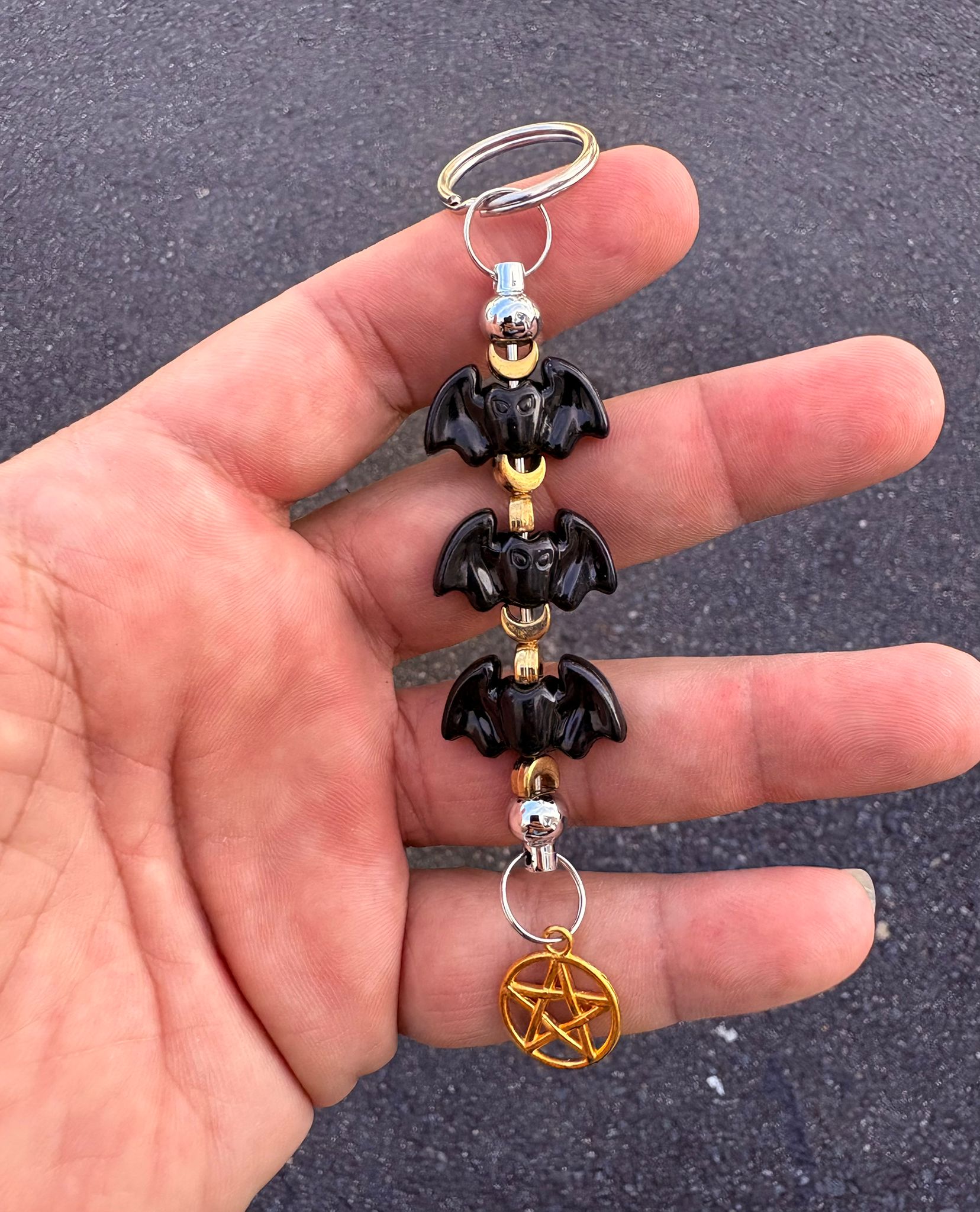 Llavero con murciélagos, lunas y pentagrama. Plata y 2 tonos