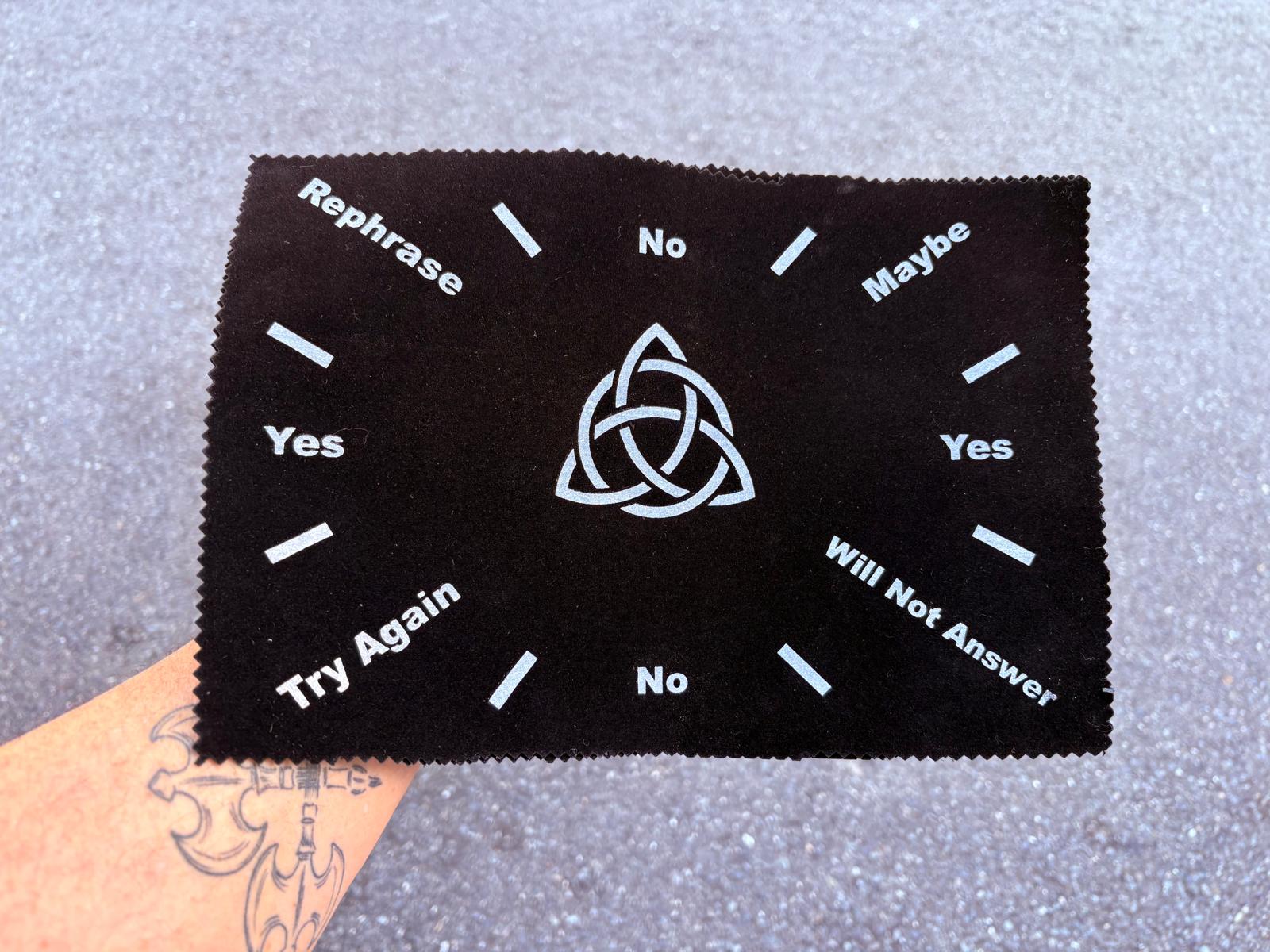 Tela gruesa negra con letras plateadas y nudo de bruja